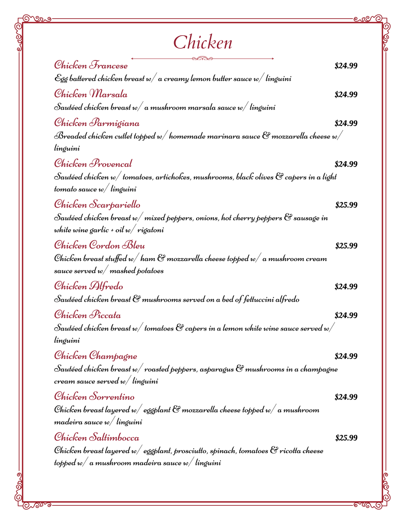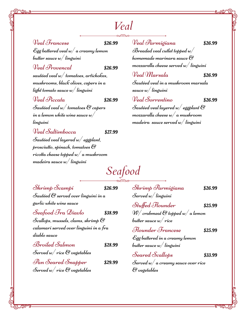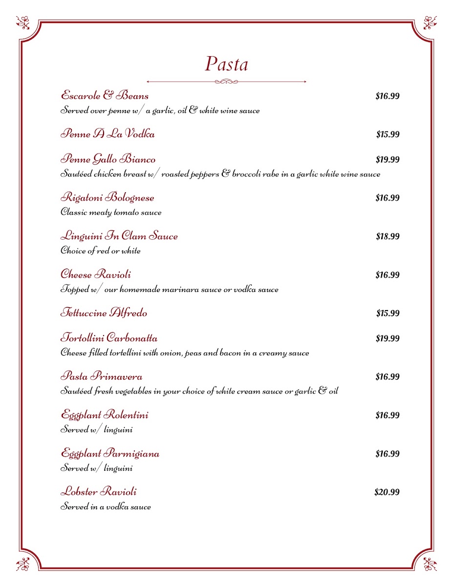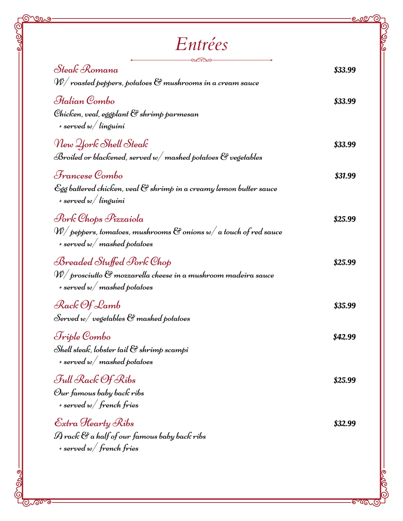 From a reviewer’s perspective, the menu at Alfredo’s offers a well-rounded selection of classic Italian-American dishes, with hearty entrées and traditional pasta options that cater to a variety of tastes. Standout entrée choices include Steak Romana, New York Shell Steak, Francese Combo, Pork Chops Pizzaiola, and the Breaded Stuffed Pork Chop, each reflecting a rich, savory approach to classic meat dishes. The chicken section is equally appealing, featuring favorites like Chicken Francese, Chicken Marsala, Chicken Parmigiana, Chicken Provencal, and Chicken Scarpariello, offering a mix of buttery, wine-based, and tomato-forward flavors. Veal lovers can enjoy traditional preparations such as Veal Parmigiana, Veal Francese, Veal Provencal, Veal Marsala, and Veal Piccata, while seafood options like Shrimp Scampi, Shrimp Parmigiana, Stuffed Flounder, Seafood Fra Diavlo, and Flounder Francese provide lighter yet flavorful alternatives. The pasta selection, including Escarole & Beans, Penne A La Vodka, Penne Gallo Bianco, Rigatoni Bolognese, and Linguini In Clam Sauce, rounds out the menu with comforting, classic Italian dishes, making the overall menu feel traditional, satisfying, and diverse enough for both casual diners and those looking for a hearty Italian meal.